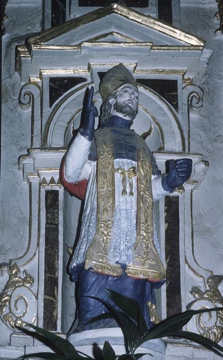 Le tableau central est surmonté d'une inscription, et d'une niche à colonnettes d'où s'échappent des cornes d'abondance. Quatre colonnes de marbre ornent le retable. Des statues sont placées dans les deux niches latérales.