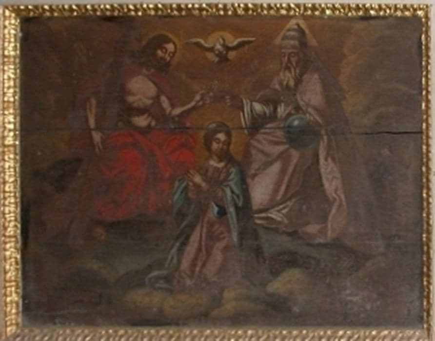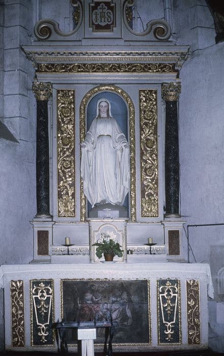 Retable composé d'une niche entre deux panneaux décorés d'entrelacs dorés et de deux colonnes. Le retable présente une peinture du Couronnement de la Vierge.