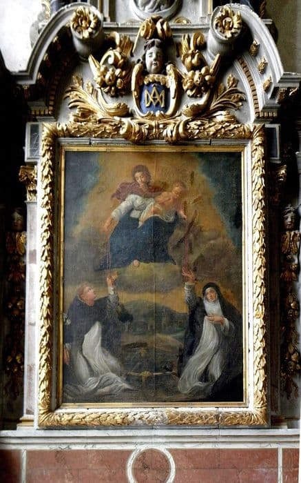 L'autel est surmonté d'un tableau représentant la remise du rosaine, au-dessus duquel est une niche sous fronton triangulaire. Cette contient une Assomption entre deux anges en cariatides et deux colonnettes de marbre. Les niches latérales qui renferment les statues de saint-Appoline et de sainte Agathe sont encadrées par des colonnes de marbre et surmontées de fronton arrondis sommés de pots à feu.