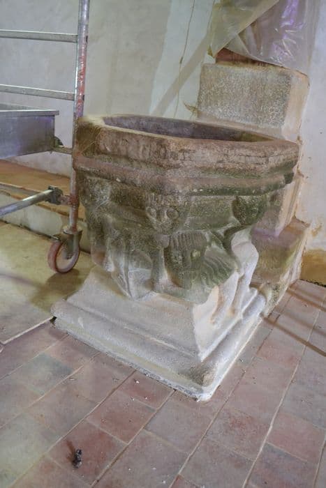Base carrée supportant une cuve octogonale. Dans la mouluration supérieure, têtes d'hommes et d'animaux alternés à chaue angle. Au-dessous, deux monstres, animaux à figures humaines, maintiennent un écusson représentant à gauche un homme à corps de serpent et à droite une tête de bélier.