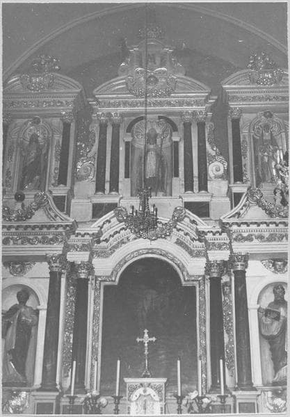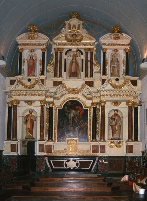 Retable comportant cinq statues anciennes. Au centre, tableau contemporain du retable.