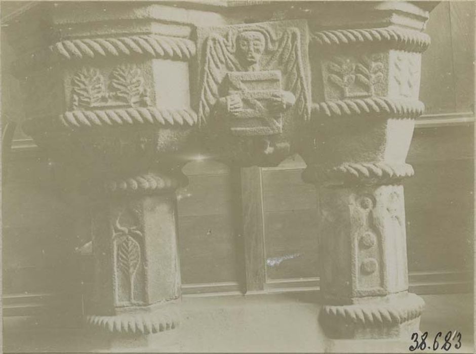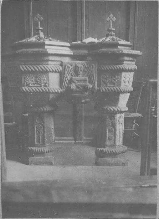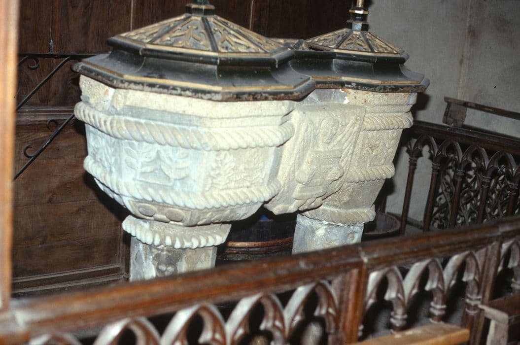 Fonts baptismaux géminés : double cuve sur pied propre à chacune d'elle. Elles sont réunies par un petit héraut en bas-relief. Les deux cuves sont hexagonales, à double torsade entourant une frise d'arbres. Le pied, hexagonal, est terminé en haut et en bas, par une torsade.