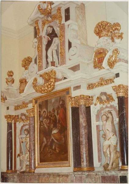 Au centre, un tableau encadré de grosses moulures. A droite et à gauche, des niches amorties en coquilles et encadrées à leur partie supérieure par les ailes qui entourent une tête de chérubin. Deux pilastres cannelés (un de chaque côté du tableau) et quatre colonnes (une de chaque côté de chacune des niches) surmontés de chapiteaux corinthiens, supportent un entablement. Au-dessus du tableau central, un fronton courbe orné d'une guirlande, et surmonté d'une niche.