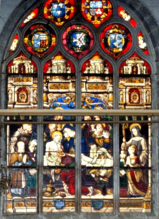 Fenêtre divisée par 3 meneaux. Une riche architecture Renaissance abrite à scène. Dans les ajours, écussons avec armoiries.