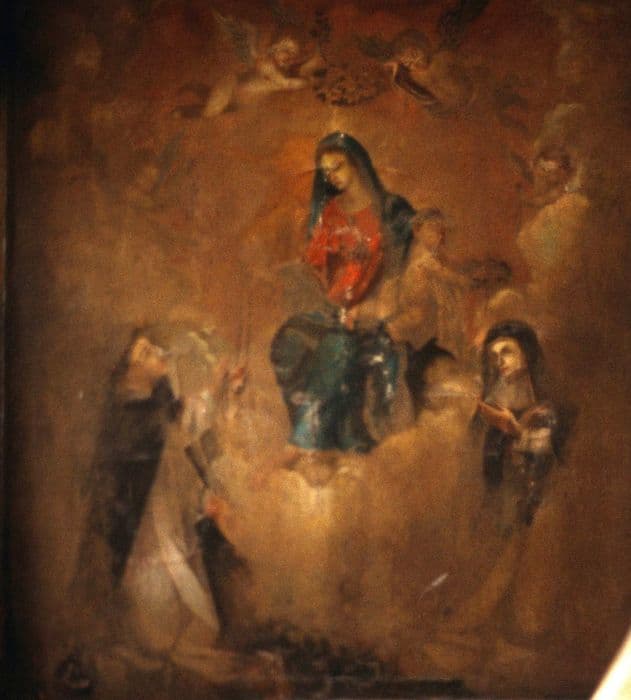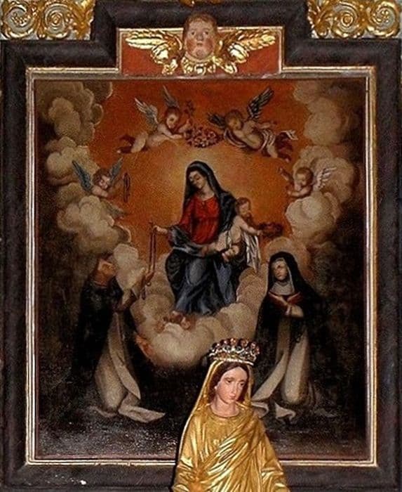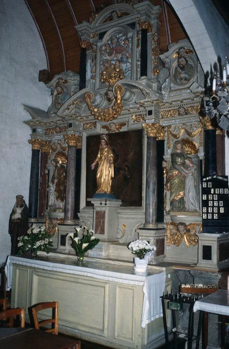 L'autel est surmonté d'un tabernacle et d'une Vierge moderne. Le tableau central est placé entre deux colonnes de marbre rouge accolées à des pilastres noirs. Aux extrémités, au-delà des niches latérales les colonnes sont noires et les pilastres rouges. Les niches (occupées par des statues modernes) sont surmontées de médaillons. Décoration de fleurs et de têtes d'anges.