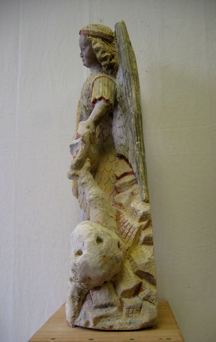 Le saint est debout sur un dragon. En appuis sur sa jambe droite, son corps déhanché forme une courbe. Il tenait dans sa main droite levée (main disparue) une lance qui est aujourd'hui en partie cassée transperce le ventre du dragon situé à ses pieds. Il porte dans sa main gauche un bouclier avec un écusson en forme de croix. le dragon lève sa patte droite en repoussant le bouclier. Saint Michel est vêtu d'une tunique en plumes qui le recouvre entièrement. Deux grandes ailes confirment sa qualité d'archange. Derrière le saint, il semble y avoir une montagne représentée par un amas de petits cubes. Saint Michel a les traits fins avec des yeux étirés en longueur. Les paupières inférieures et supérieures sont légèrement incurvées. Le globe est peu saillant. Sa bouche affiche un léger sourire. Le sillon médian de la lèvre supérieure est bien marqué. Le menton est arrondi. Sa chevelure ondulée est maintenue par un bandeau serti d'une pierre carrée.