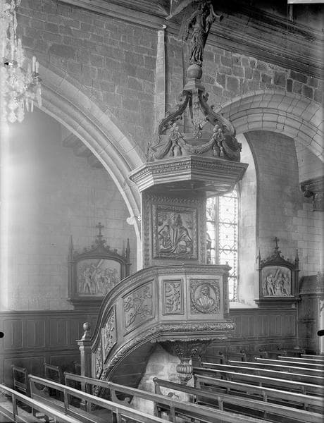 Chaire comprenant un escalier à quartie tournant avec trois panneaux décorés de feuillages. La cuve comporte quatre panneaux, deux grands et deux petits décorés de feuillage sauf un représentant un buste de femme dans un médaillon. Au-dessous, un amortissement en feuillage. Abat-voix composé de six consoles supportant une boule sevant de piédestal à l'ange du Jugement.