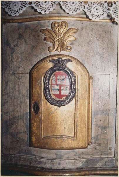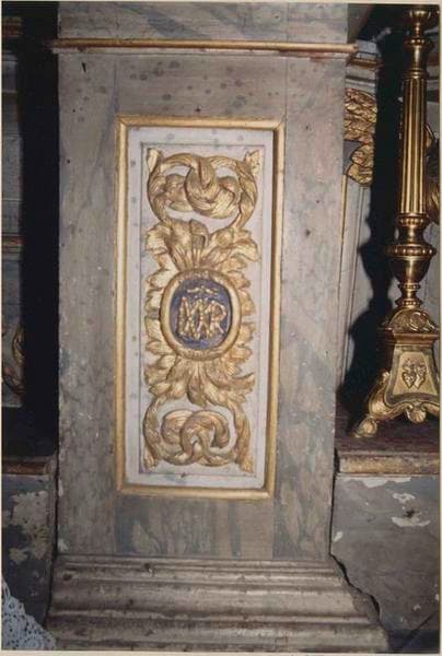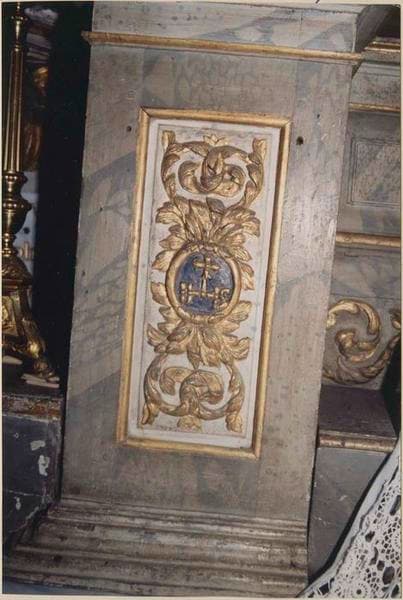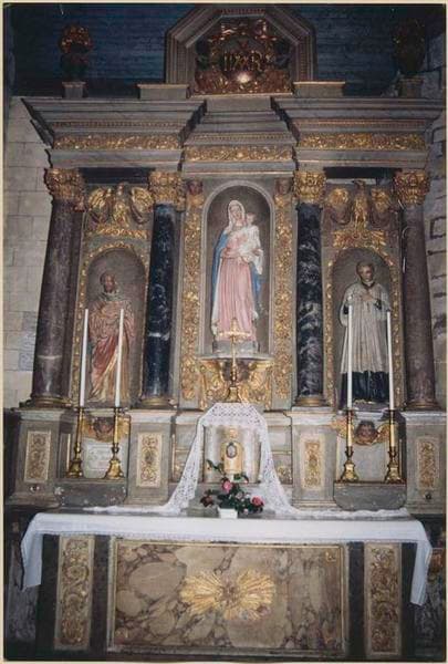 Retable composé de trois niches occupées par des statues, et séparées par des colonnes. Les deux niches latérales sont surmontées d'aigles aux aigles déployées.