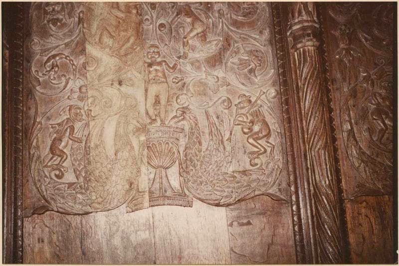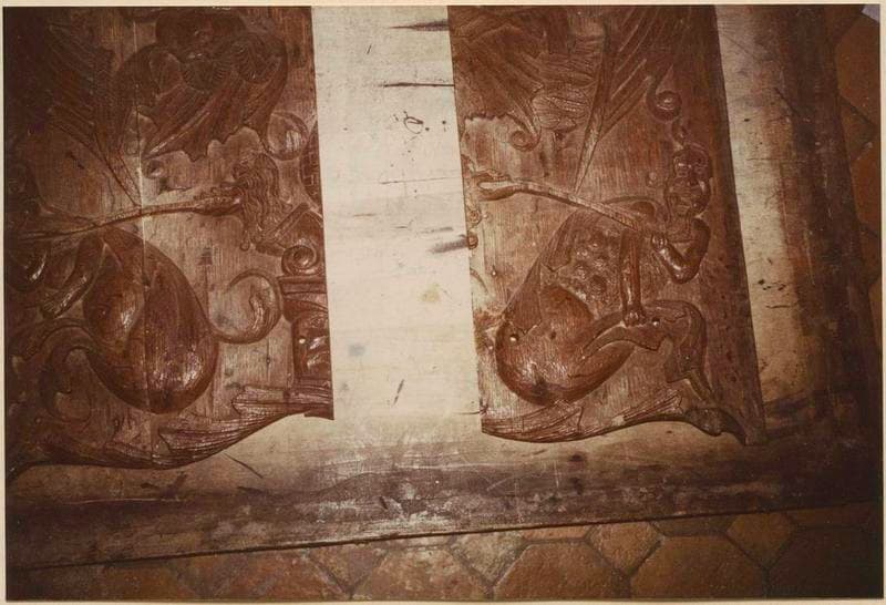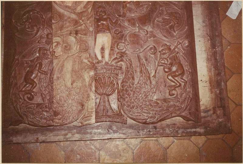 Stalles (?). Sièges avec miséricordes à têtes sculptées. Accoudoirs sur colonnettes ornées. Hauts dossiers avec très fines arabesques dans la partie supérieure, séparés par des colonnettes ornées. Voussure en bois, corniche et baldaquin sculptés.