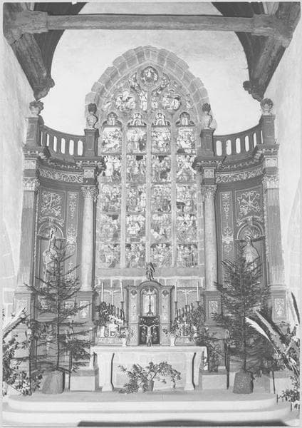 La contre-table comporte un miroir et une statuette. Deux hautes ailes en quart de cercle laissent la baie centrale dégagée, disposition assez fréquente au 18e siècle dans l'ancien diocèse de Saint-Malô.