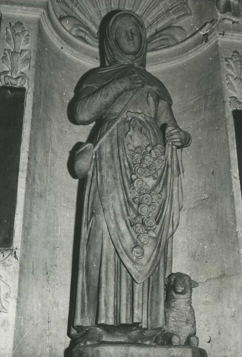 Retable à colonnes en marbre noir. Le centre contient une statue. De chaque côté, une niche abrite une statue peinte.