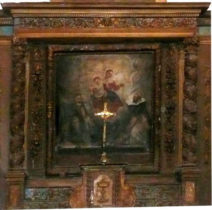 Deux colonnes torses encadrent le tableau du Rosaire, dont les fûts sont ornés de guirlandes de chine dorées. Deux pilastres cannelés flanquent les niches latérales. La niche supérieure s'appuie sur des consoles renversées décorées de feuilles d'acanthe dorées.