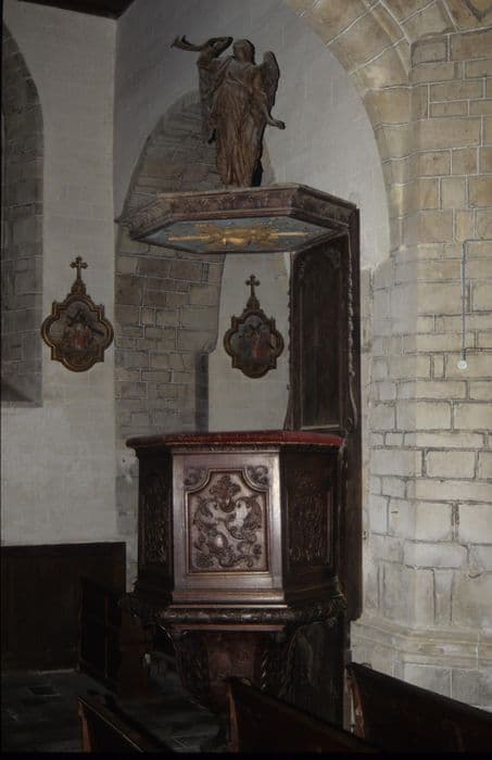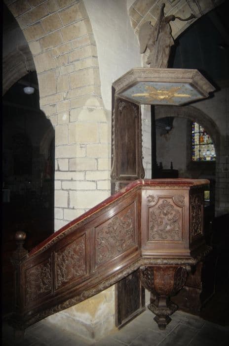 L'abat-voix est une couronne fermée où les fleurs de lys alternent avec les trèfles. Il est surmonté d'un ange. Le dossier est flanqué de deux ailes rectangulaires avec des rinceaux et arabesques. Les cinq panneaux de la tribune ont une ornementation rocaille de coquilles, entrelacs, de palmes et rinceaux. Une frise de feuilles d'acanthe, une autre de rinceaux fleuris s'allongent à la partie supérieure et à la partie inférieure de la tribune et de la rampe. Le cul-de-lampe sculpté de nattes est recouvert d'un lacis de motifs rocaille.