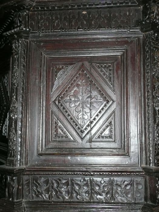 Cuve comportant cinq panneaux sculptés, supportée par une colonne torse avec feuillage, terminée par des consoles. Cinq grandes consoles avec pieds de griffons, têtes et feuilles d'acanthe, partent du pied de la colonne pour soutenir la cuve.
