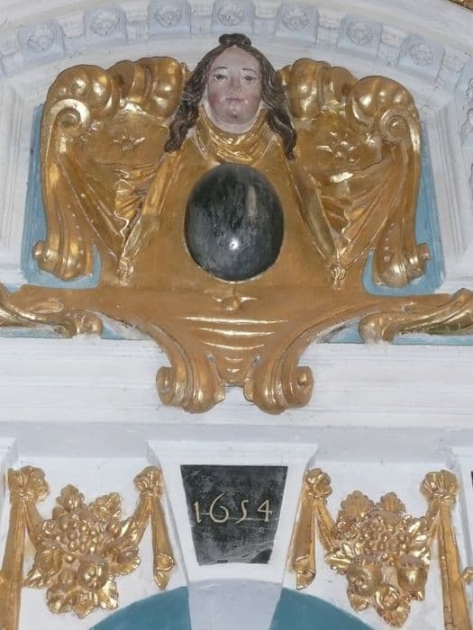 Retable en bois, avec des colonnettes en marbre, des médaillons, des obélisques. Au centre, le groupe sculpté.
