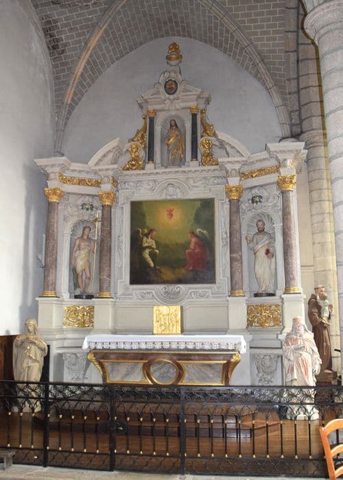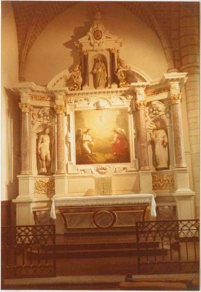 Retable constitué d'un soubassement supportant quatre colonnes corinthiennes qui encadrent deux niches avec sculptures et un tableau dans un cadre en pierre. Entablement avec frise sculptée. Au-dessus de la partie centrale, une niche entre des colonnes de marbre et des cariatides. Corniche cintrée.