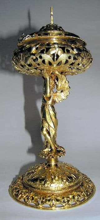 Pyxide en forme de petit ciboire. Pied arrondi terminé par une frise ajourée. Deux scènes le décorent.