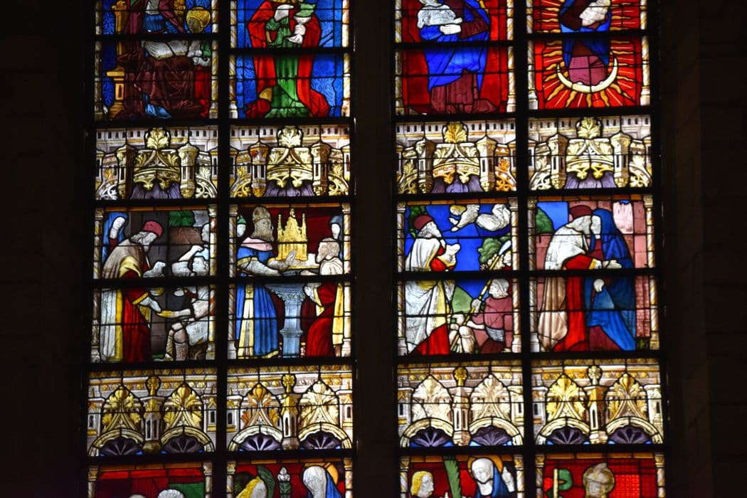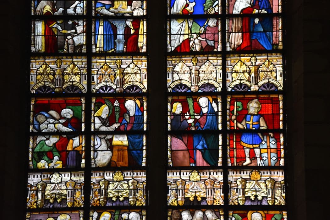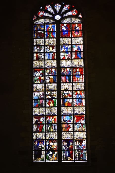 Grande fenêtre de l'abside, divisée en huit travées et formée de 96 panneaux, plus les lancettes et les ajours. Fenêtre du transept sud, divisée en quatre travées et formée de 72 panneaux, plus les lancettes et les ajours.