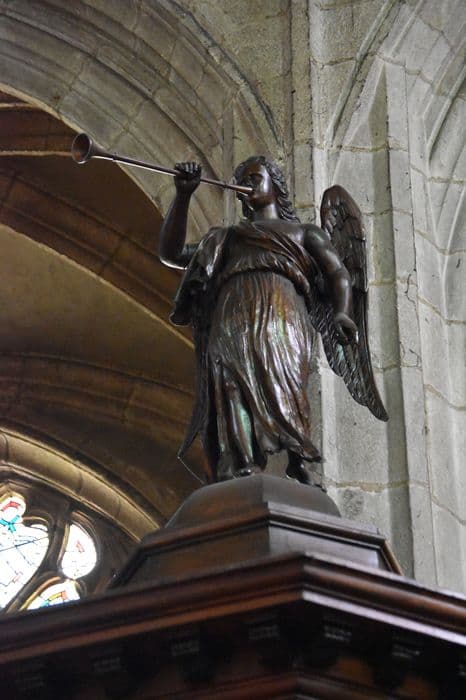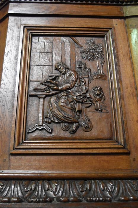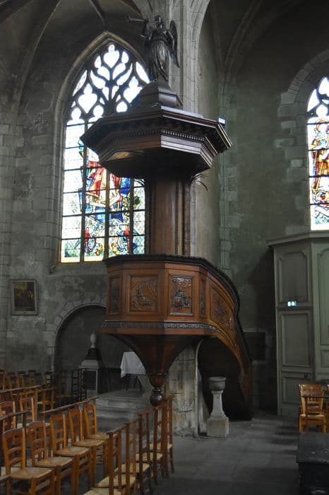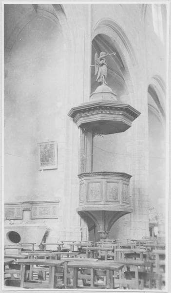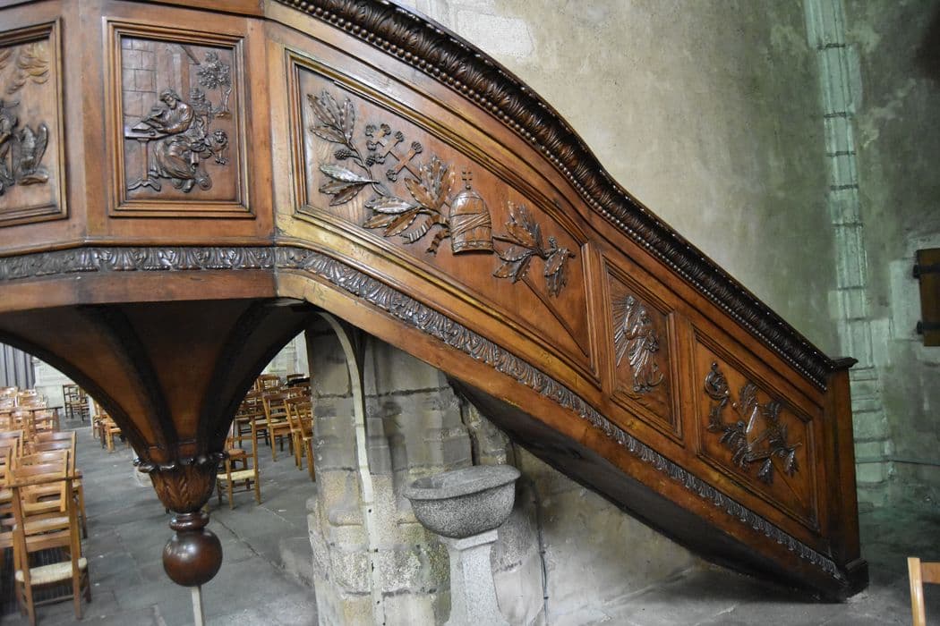Abat-voix surmonté d'un dôme que domine un ange. Sept panneaux décorent la tribune. La rampe est décorée de mîtres.