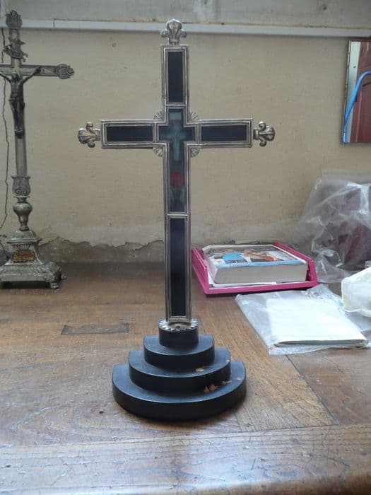 Reliquaire de la parcelle de la Vraie Croix rapportée par Pierre Croc en 1761. Les bras de la croix sont terminés par des fleurs de lys. La croix est placée sur un socle comprenant quatre gradins circulaires.