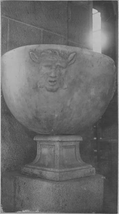 Cuve elliptique ornée de quatre têtes à longues oreilles. Base carrée.