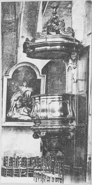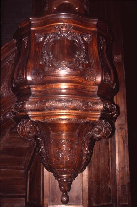 L'abat-voix est surmonté de consoles renversées et couronné par un pot-à-feu. La cuve à trois panneaux est galbée. Le cul-de-lampe est sobrement décoré.