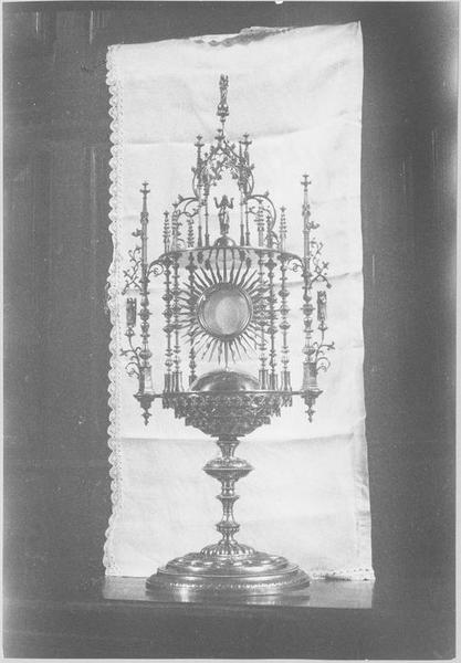Sur une base circulaire décorée d'oves, de 8 lobes et de godrons, le pied au noeud circulaire ciselé porte un culot décoré de trois cercles de lobes tréflés. Sur ce culot, un plateau circulaire porte un demi-globe entouré de 6 candélabres. Au-dessus du globe, monstrance en forme de soleil. Deux candélabres plus grands, en encorbellement sur le plateau portant deux anges en ronde bosse. Les 6 candélabres portent un autre plateau circulaire surmonté de pinacles gothiques et 4 colonnettes torsadées portant des gâbles ajourés en accolade polylobée formant dais.