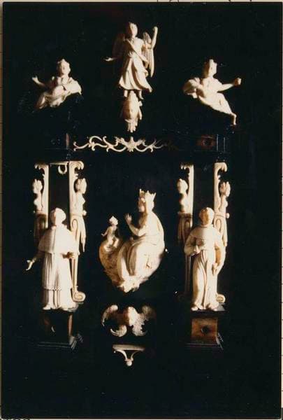 Panneau de dévotion. Fond et cadre en bois à décor brodé, applications d'ivoire.