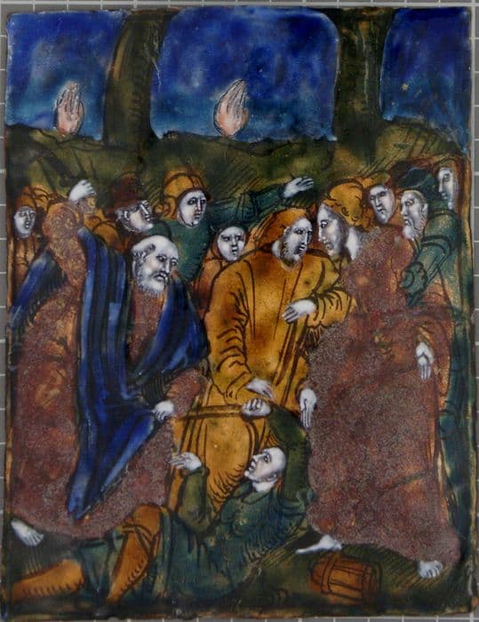 Plaque faisant partie du panneau central d'un triptyque formé de 32 panneaux d'émail peint.