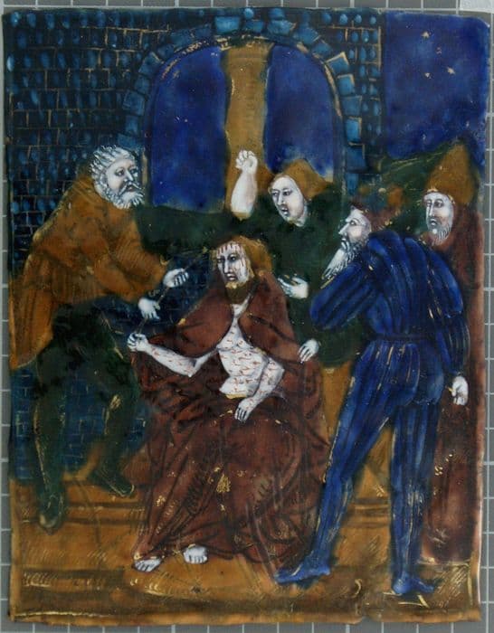 Plaque faisant partie du panneau central d'un triptyque formé de 32 panneaux d'émail peint.