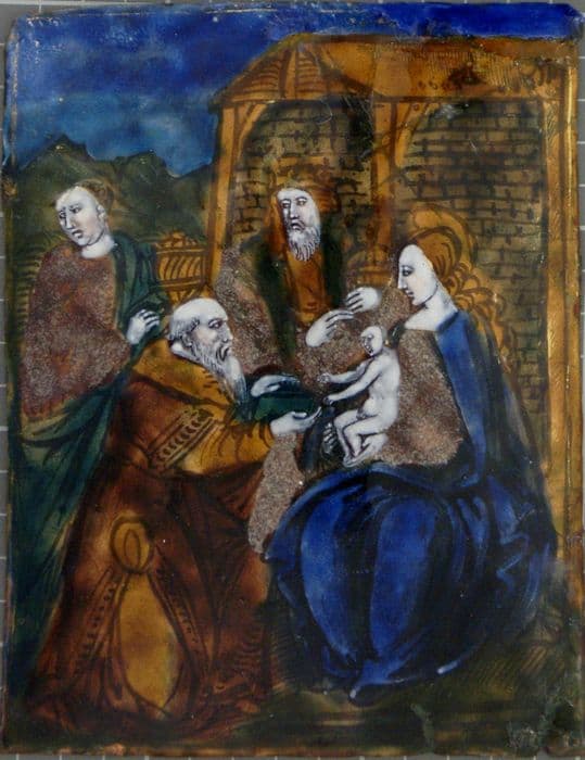 Plaque faisant partie du volet droit d'un triptyque formé de 32 panneaux d'émail peint.