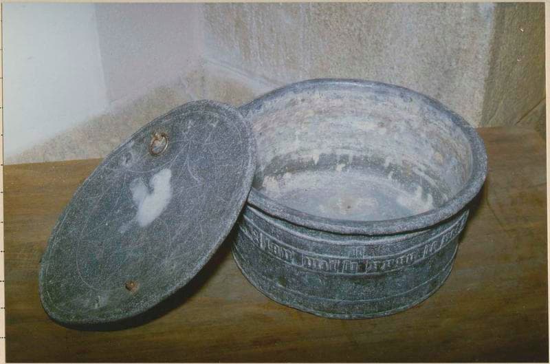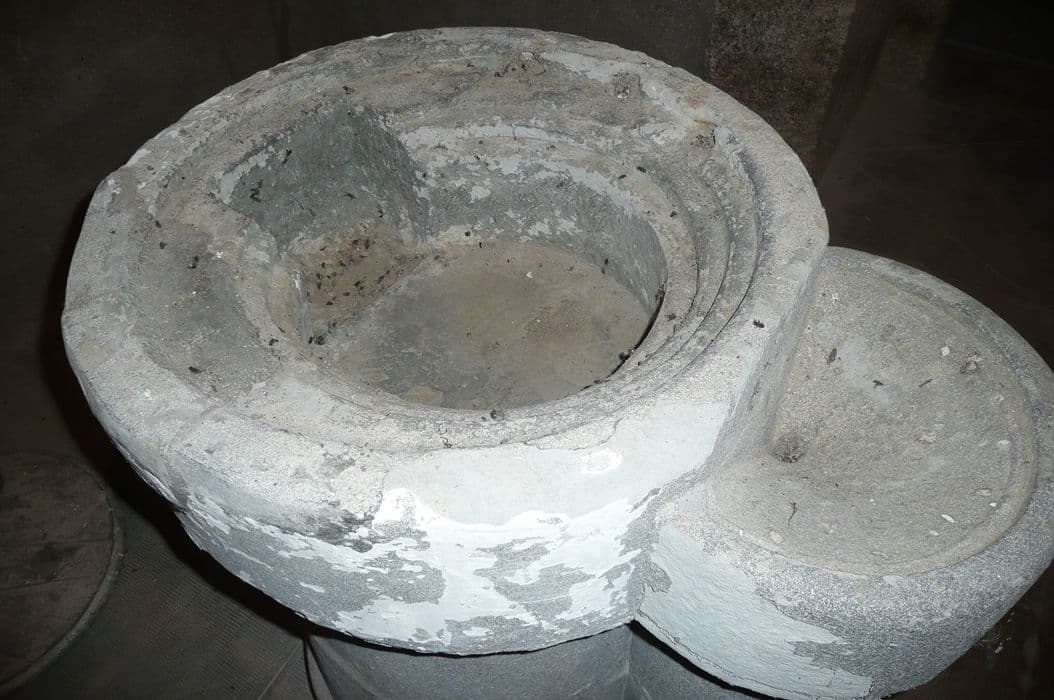 Fonts baptismaux en granite, bassin et son couvercle en plomb.