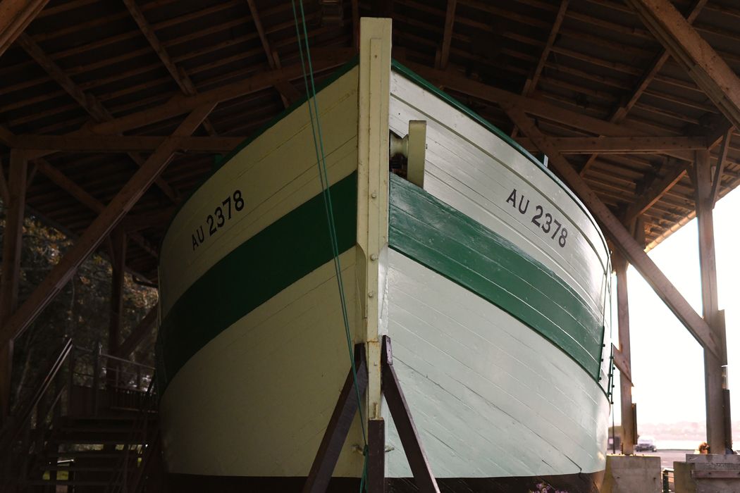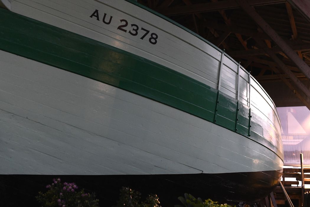 Coque en bois. Bateau de charge dundée. Malgré son état déplorable, le bateau reste indéniablement très beau grâce à ses formes d'une grande finesse et à son arrière camaretois d'une élégance oubliée.