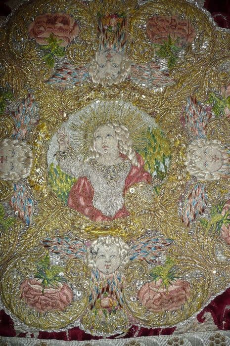 Broderie, tissu, soie, velours façonné, application sur textile, drap d'argent. Médaillon brodé.