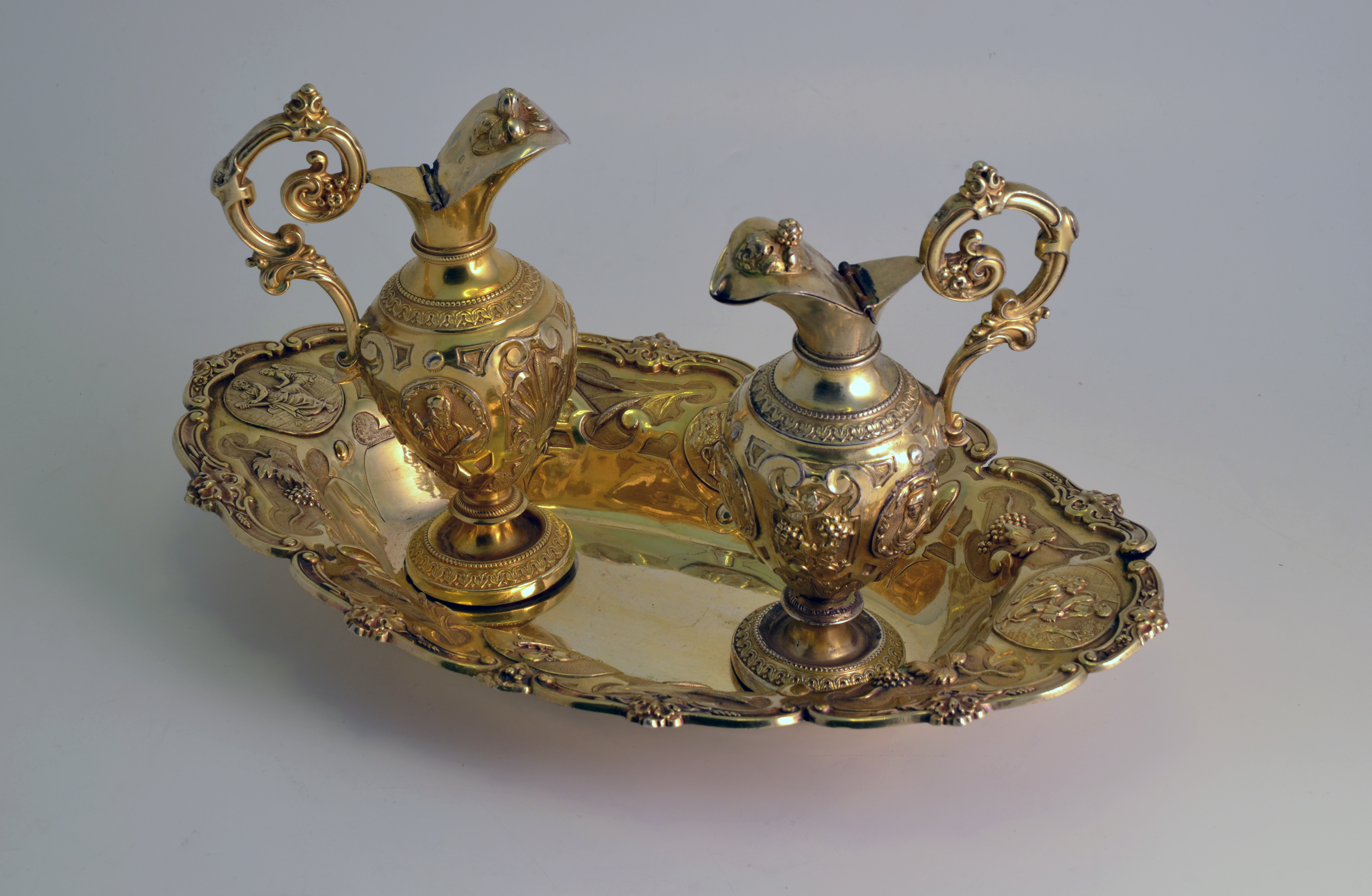 La burette à eau volée est en argent doré, décor au repoussé et ciselé portant un médaillon en buste de saint Joseph (?) et a priori deux autre médaillons représentant la Vierge et le Christ (comme sur la burette à vin non volée), alternant avec un décor d’épis de blé. Poinçon de titre : Paris, tête de Minerve, après 1838 ; de maître : Pierre-Henry Favier.