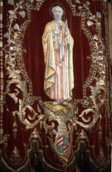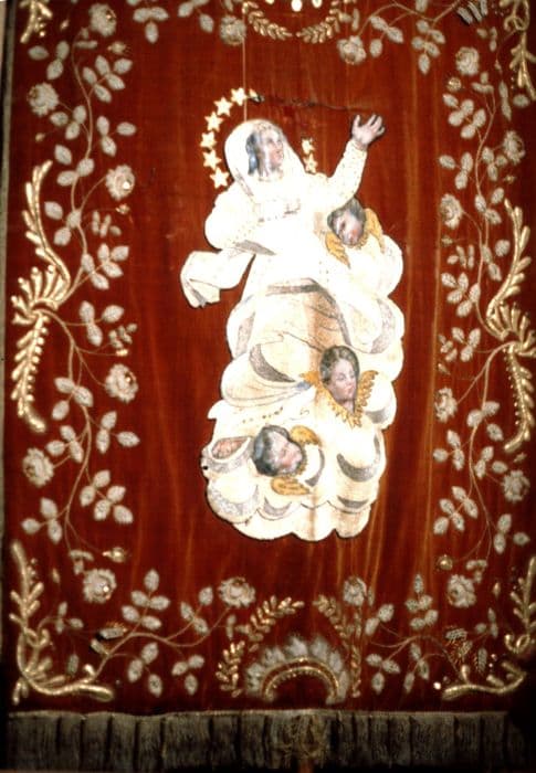 L'une des bannières représente l'Assomption et saint Pierre, l'autre la Vierge à l'Enfant et saint Pierre.