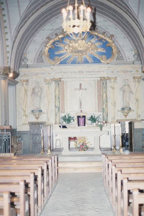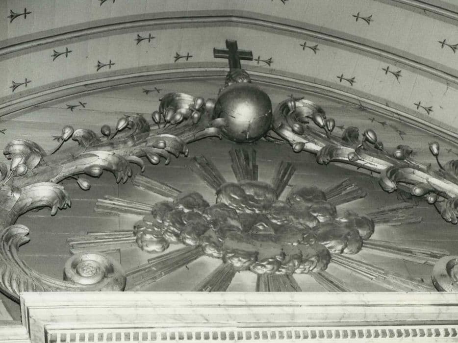 Retable néo-classique à décor Empire comportant quatre pilastres à chapiteaux, deux colonnes à fût lisse et à chapiteaux. Le sommet du retable est couronné par une gloire. Deux statues en bois encadrent le retable. Le tableau a disparu et la table d'autel a été transformée.