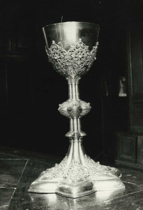 Calice en argent doré et fausses pierres. Assemblage : pied doublé, tige à collerette et noeud rapportés, fausse coupe ajourée et coupe enchâssée à l'intérieur. Pied polylobé en tiers point ainsi que la collerette et le noeud.