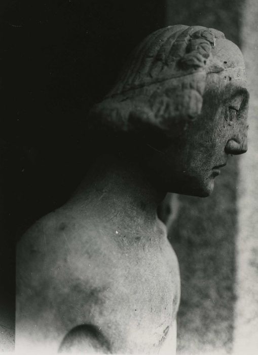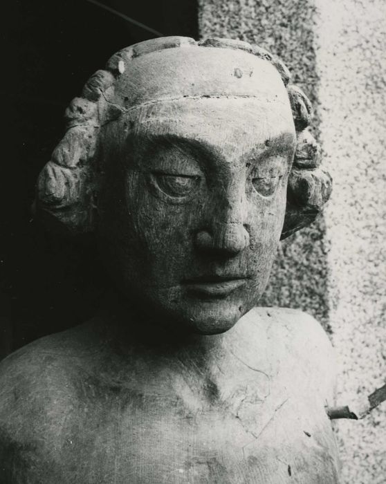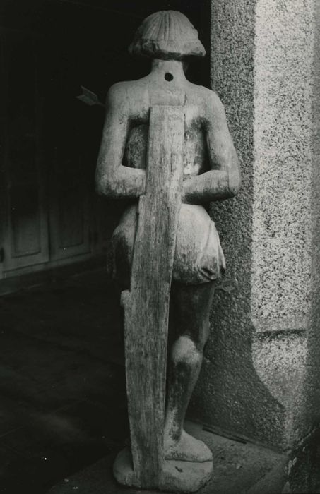 Statue d'applique (base entaillée). Traces de polychromie au dos du personnage à hauteur de la taille. Le revers est sculpté. L'attitude est antifrontale (pied gauche reculé), les pieds sont légèrement en pente sur la base. Les cheveux sont mi-longs à petites boucles, dégageant le front. Assemblage : traces de fixation au niveau du cou, calotte crânienne collée, coude du bras gauche constituée d'une pièce clouée.