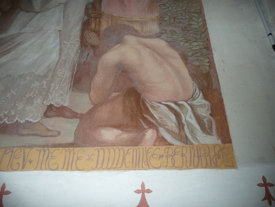 Peintures appliquées à la détrempe sur enduit. Situées sous les baies dans le choeur, elles couvrent le chevet arrondi sur environ quarante-deux mètres carrés.