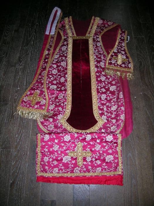 ornement rouge : chape, chasuble, étole de clerc, voile de calice