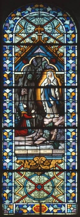 ensemble de neuf verrières (grisailles) et cinq verrières : Saint François d'Assise recevant le corps du Christ (baie 0), Apparition de la Vierge de Lourdes (baie 1), Saint Jean Baptiste (baie 2), Sacré-Coeur de la Vierge (baie 3), Sacré-Coeur de Jésus (baie 4)