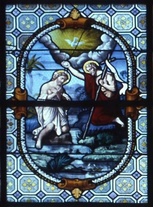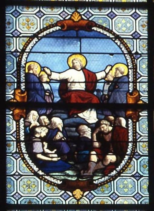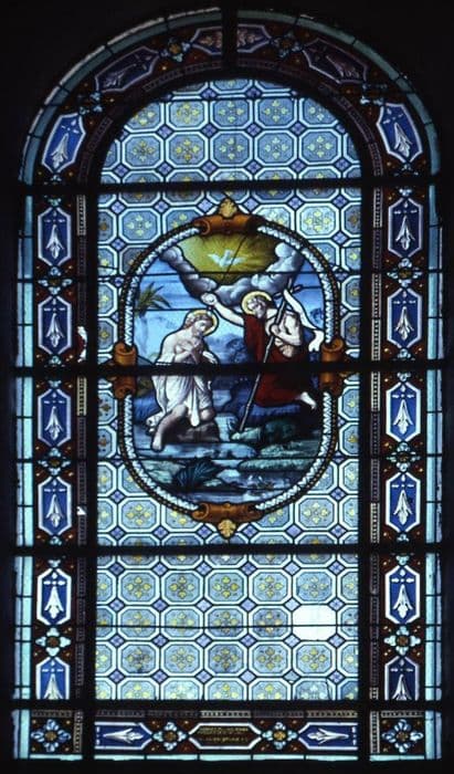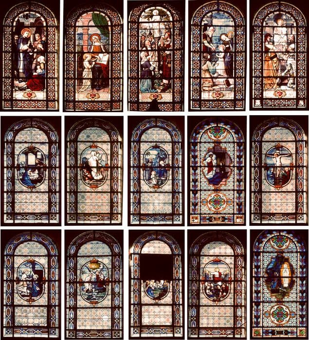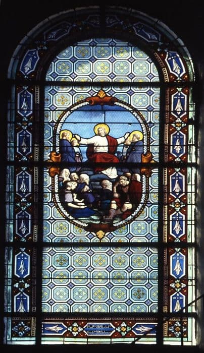 POP | Plateforme ouverte du patrimoinetreize verrières : Fidèles vénérant une statue de sainte Anne (baie 0), Présentation au Temple (baie 1), Education de la Vierge (baie 2), Saint Joseph et l'Enfant Jésus (baie 3), Saint Yves (baie 4), Annonciation (baie 7), Ascension (baie 8), Nativité (baie 9), Résurrection (baie 10), Sainte Famille (baie 11), Crucifixion (baie 12), Baptême du Christ (baie 13) et Christ enseignant (baie 14)