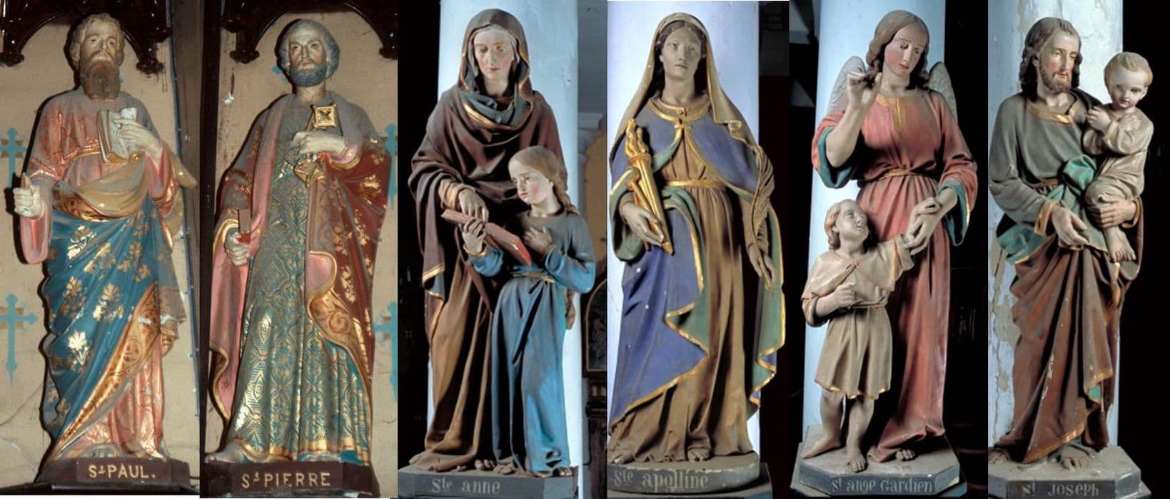quatre statues : Saint Paul, Saint Pierre, Sainte Apolline et Saint Joseph et deux groupes sculptés : Sainte Anne et la Vierge, Tobie et l'Ange