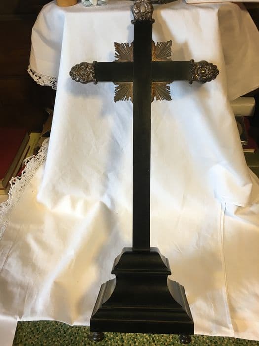 Croix-reliquaire en argent et coffret en bois noirci.