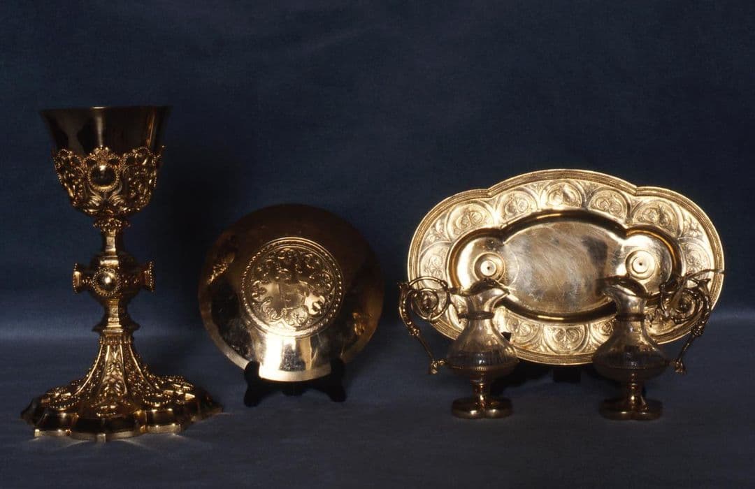 chapelle de messe : calice, patène, burettes et leur plateau