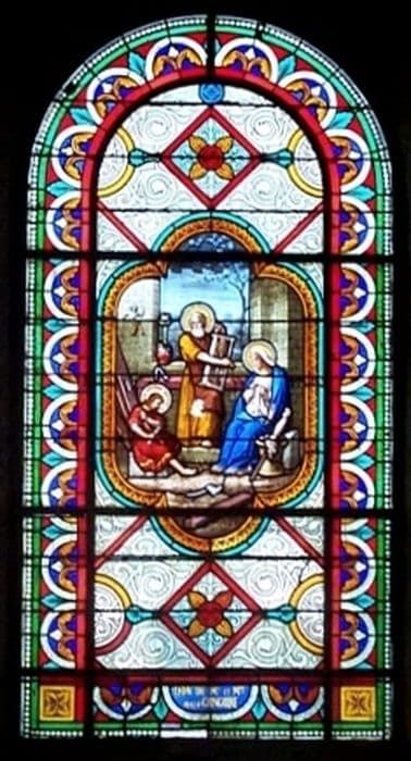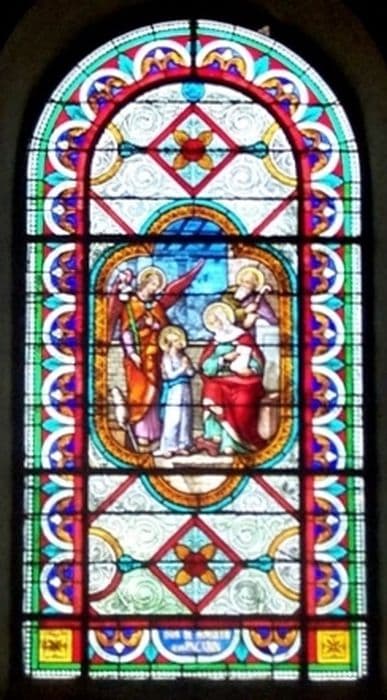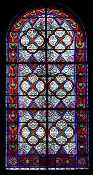 Ensemble de huit verrières dont quatre grisailles identiques et quatre verrières représentant des personnages.