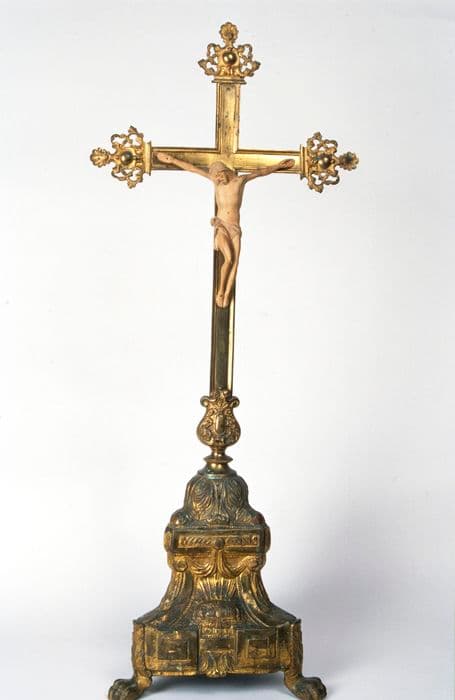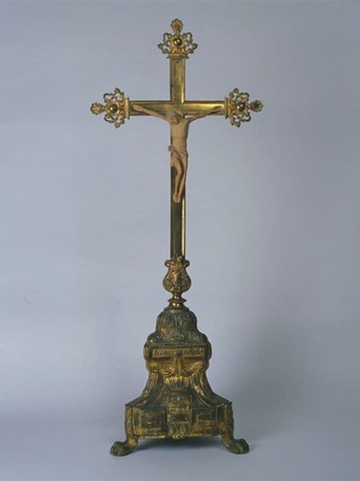 Croix d'autel, y compris le pied, en tôle de laiton dorée à l'or.
