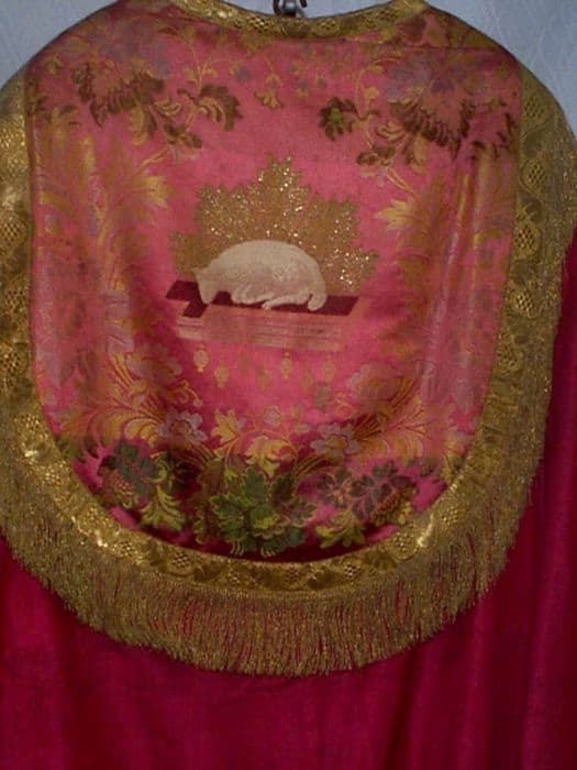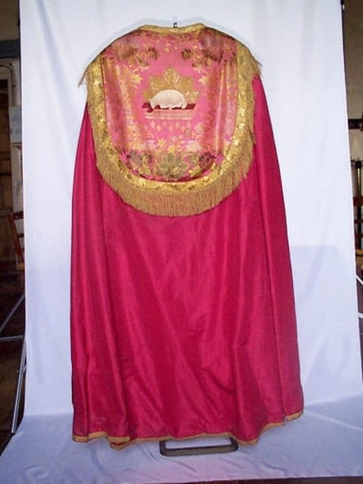 Chape doublée de percale glacée, en soie (brocarts), or et argent.