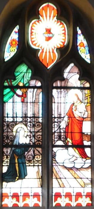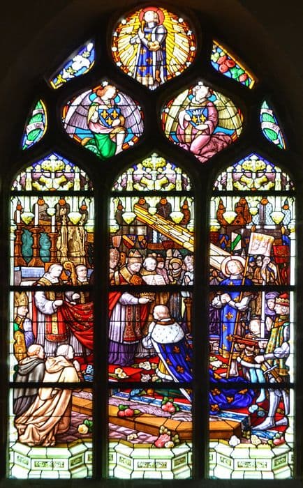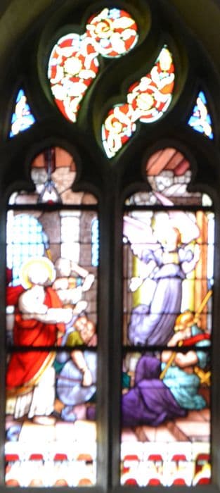 POP | Plateforme ouverte du patrimoineneuf verrières : Sainte Famille (baie 4), Couronnement de Charles VII (baie 5), Apparition du Sacré-Coeur à Marguerite Marie Alacocque (baie 7), Apparition de la Vierge à Bernadette Soubirous (baie 9), Délivrance de Saint Pierre par un ange (baie 11), Saint François de Sales enseignant (baie 16), Education de Saint Louis (baie 13), Sainte Elisabeth de Hongrie distribuant du pain aux mendiants (baie 18), Vierge à l'Enfant apparaissant aux poilus dans les tranchées (baie 15)